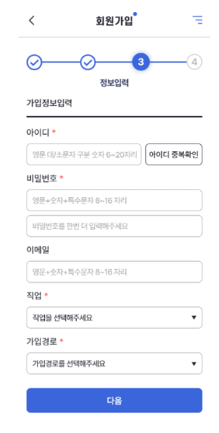 6) 가입에 필요한 아이디, 비밀번호, 직업, 가입경로 등 필수항목을 모두 작성해 주세요.