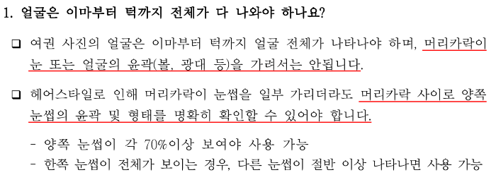또 이런 Q&A 글도 홈페이지에 나와 있는데요. 실제로 다른 블로그의 어떤 분은 시스루뱅 앞머리를 해서 눈썹이 군데 군데 가렸는데도 무난히 통과했다고 하더라고요. 저는 제가 골치 아프게 찍고 하기 싫어서 처음부터 사진관에 가서 포토그래퍼 분만 믿고 의심이 여지 없이 사진을 제출했는데 이렇게 되서 너무 짜증나고 황당하더라고요.