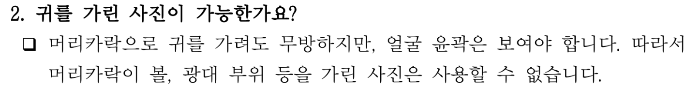 그리고 여권 사진 중에 귀가 잘 보이는지도 걱정되는 부분 중 하나인데요. 저는 특히나 귀가 뒤로 달라붙어 있는 스타일이라 예전에 여권 사진 찍을 때 많이 고생을 했었어요. 그런데 Q&A를 통해 최근에는 귀 부분에 대해서는 규정이 많이 약화된 것을 확인할 수 있었습니다.