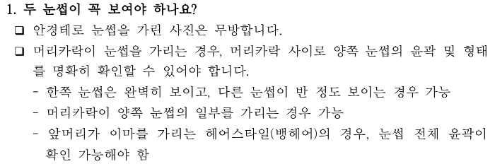 또 이런 Q&A 글도 홈페이지에 나와 있는데요. 실제로 다른 블로그의 어떤 분은 시스루뱅 앞머리를 해서 눈썹이 군데 군데 가렸는데도 무난히 통과했다고 하더라고요. 저는 제가 골치 아프게 찍고 하기 싫어서 처음부터 사진관에 가서 포토그래퍼 분만 믿고 의심이 여지 없이 사진을 제출했는데 이렇게 되서 너무 짜증나고 황당하더라고요.