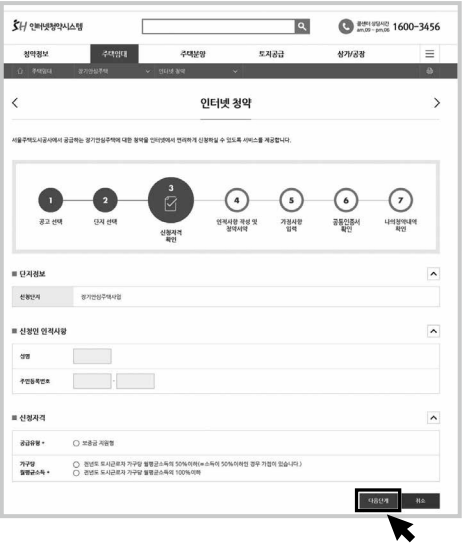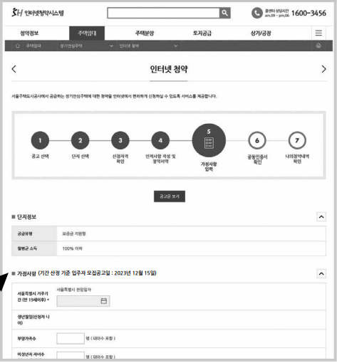 5. 신청인의 인적사항을 입력하고 공급유형, 가구당 월평균 소득 등 신청 자격을 체크합니다.