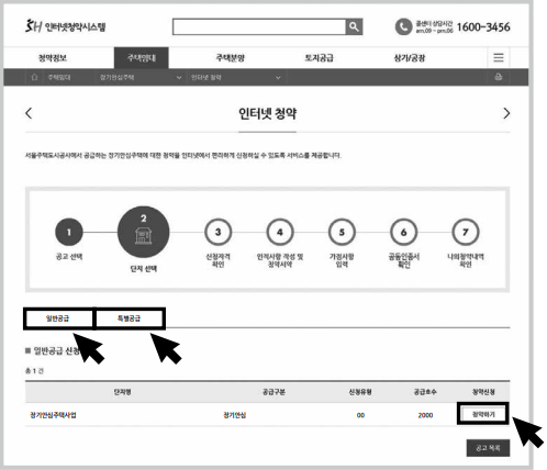 4. 일반공급 또는 특별공급을 선택해 '청약하기'를 클릭합니다.